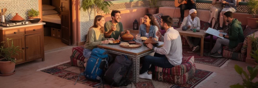 Les espaces communs sont le cœur battant des auberges de jeunesse marocaines. Ils prennent la forme de patios intérieurs, de toits-terrasses avec vue sur les toits de la médina ou de salons décorés dans un style berbère avec tapis tissés, poufs et tables basses. Ces lieux favorisent les rencontres, les repas improvisés et les échanges de bons plans. Beaucoup d’hostels de Marrakech, Essaouira ou Taghazout disposent ainsi d’un rooftop où l’on prend le petit déjeuner au lever du soleil, où l’on assiste à l’appel à la prière du soir, ou encore où l’on partage un thé à la menthe après une journée d’excursion.