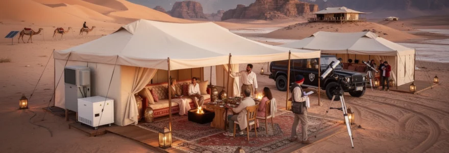 Derrière l’image poétique du bivouac de luxe dans le désert se cache une véritable prouesse technique. Comment offrir eau chaude, climatisation et restauration gastronomique au milieu de nulle part, tout en respectant un environnement fragile ? Les opérateurs de glamping désertique ont développé, au fil des années, des infrastructures sophistiquées, proches de celles d’un hôtel-boutique, mais pensées pour des conditions extrêmes. On parle ici de systèmes énergétiques autonomes, de solutions de gestion de l’eau de pointe et de structures d’hébergement capables de résister aux vents violents et aux variations thermiques importantes.