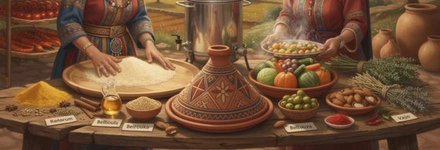 La poterie culinaire amazighe ne se limite pas à un simple contenant : elle conditionne la texture, la température et même la saveur des plats. Le tagine en terre cuite, avec son couvercle conique, permet une cuisson lente à l’étouffée où la vapeur circule et retombe en gouttelettes, concentrant les arômes sans dessécher les aliments. Le couscoussier, composé d’une marmite et d’un panier perforé posé au-dessus, illustre quant à lui l’ingéniosité berbère dans la maîtrise de la cuisson vapeur, indispensable à la réussite du couscous traditionnel.