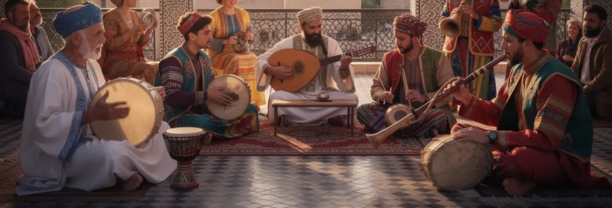 Dans la musique chaâbi et les fêtes populaires, les rythmes en 2/4 et 6/8 dominent, favorisant les mouvements de balancier du corps et les battements de mains. À l’inverse, la musique gnawa repose souvent sur des cycles de 12 temps subdivisés, qui créent une impression d’oscillation continue, propice à la transe. La musique arabo-andalouse, quant à elle, utilise des mîzân (cycles métriques) sophistiqués, associant chaque mode musical à un schéma rythmique précis. On peut comparer ces structures à des patrons de tissage : les instruments viennent « broder » leurs motifs mélodiques sur une trame rythmique immuable.