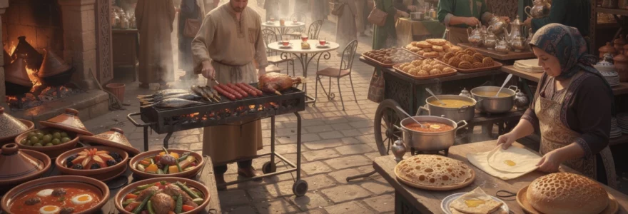 La cuisine de rue marocaine représente l’âme authentique du patrimoine culinaire du royaume. Dans les ruelles sinueuses des médinas et sur les places animées, les vendeurs ambulants perpétuent des traditions séculaires, offrant aux passants des saveurs intenses et généreuses. Cette gastronomie populaire, accessible à tous, révèle la véritable essence des épices marocaines et des techniques de cuisson ancestrales. Les arômes de cumin, de coriandre et de ras el hanout flottent dans l’air, créant une symphonie olfactive irrésistible qui guide les gourmets vers les meilleurs stands.