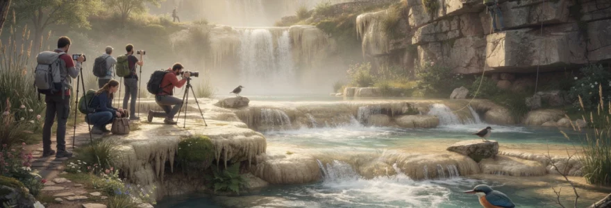 Dans ce contexte, le trépied devient l’allié indispensable du photographe, tout comme le filtre ND (Neutral Density) qui réduit la quantité de lumière atteignant le capteur. Sans ces outils, il est difficile de travailler à des vitesses lentes en pleine journée sans surexposer l’image. Il est également conseillé de privilégier les heures dorées – tôt le matin ou en fin d’après-midi – pour bénéficier d’une lumière plus douce, moins contrastée, qui met en valeur les formes des travertins et la texture de la végétation rivulaire.